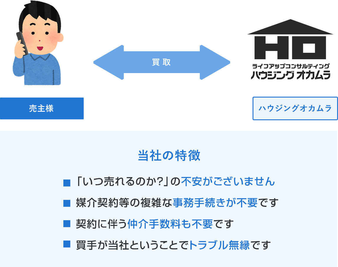 通常の場合、不動産会社に仲介依頼をし、売り主様と相談の上売り出し希望価格を決め、購入希望者をお探ししますが、ハウジングオカムラは直接売り主様の不動産を購入が可能です。ケースバイケースにはなりますが、どちらが良いか売り主様と相談の上対応させて頂きます。